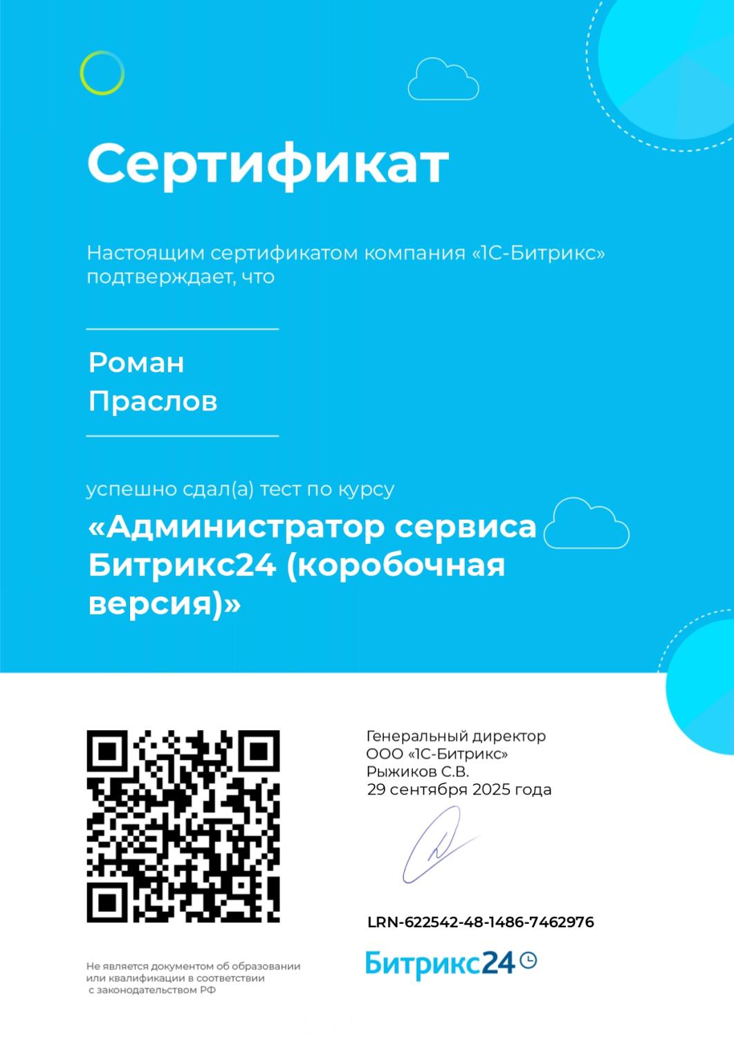 Компания «1С-Битрикс» подтверждает, что пользователь успешно сдал текст по курсу «Администратор сервиса Битрикс24 (коробочная версия)»