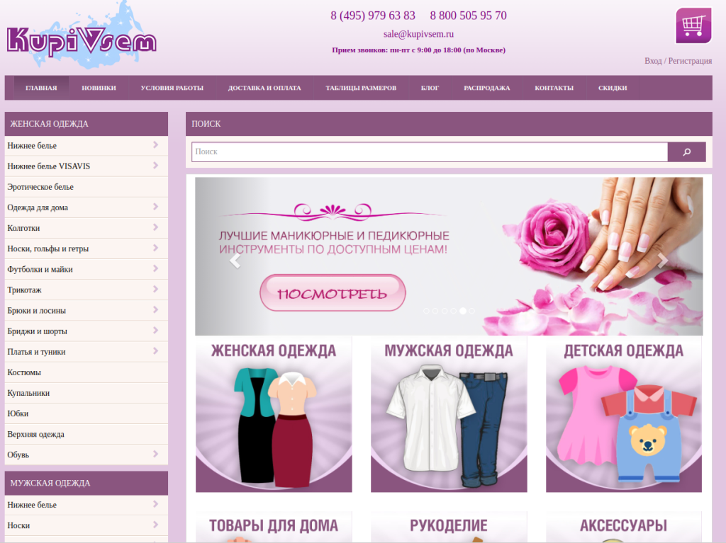 Проект kupivsem.ru представляет собой интернет-магазин одежды оптом, созданный на платформе Insales. Наша команда выполнила комплексную доработку сайта, включая переработку шаблона, адаптацию под мобильные устройства и внедрение SEO-решений.